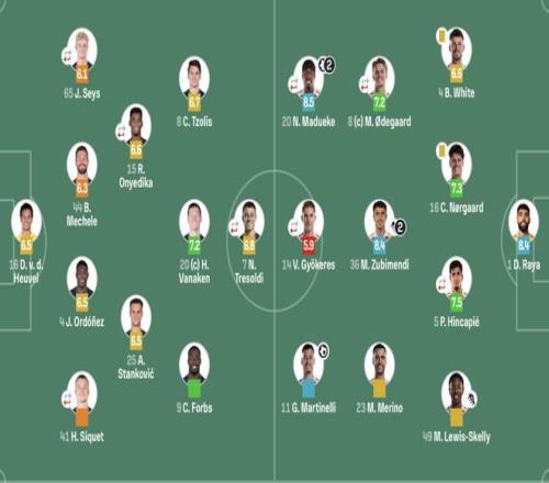 阿森納(433):1-拉亞;4-懷特(83’89-薩爾蒙),16-諾爾高,5-因卡皮耶(63’33-卡拉菲奧里),45-斯凱利;8-厄德高(71’22-恩瓦內里),36-蘇維門迪,23-梅里諾;25-馬杜埃凱(71’7-薩卡),14-哲凱賴什(62’9-熱蘇斯),11-馬丁內利